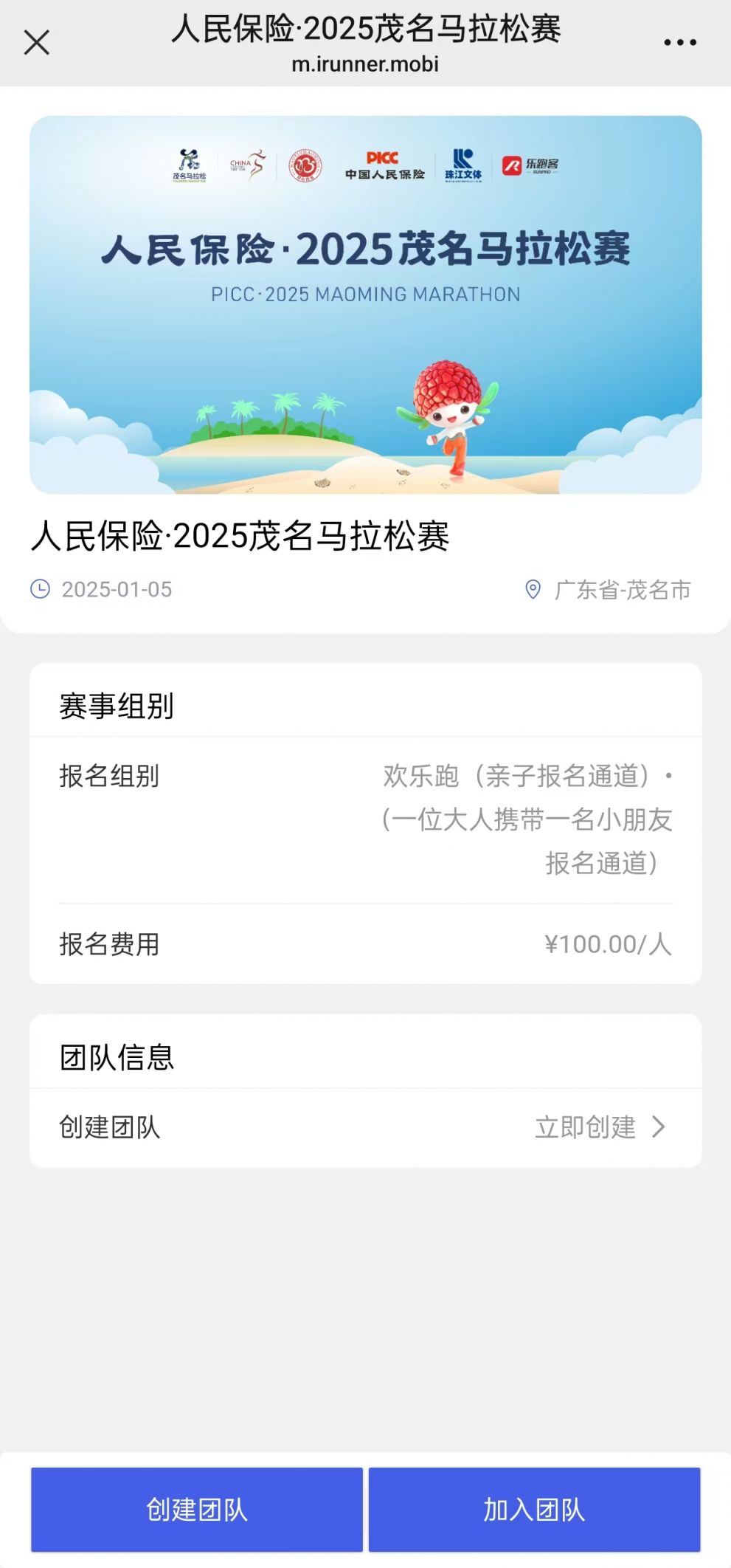 6、报名欢乐亲子跑页面可以选择加入团队及创建团队,有准备一起跑的亲朋好友和邻居跑友可以一起组队;