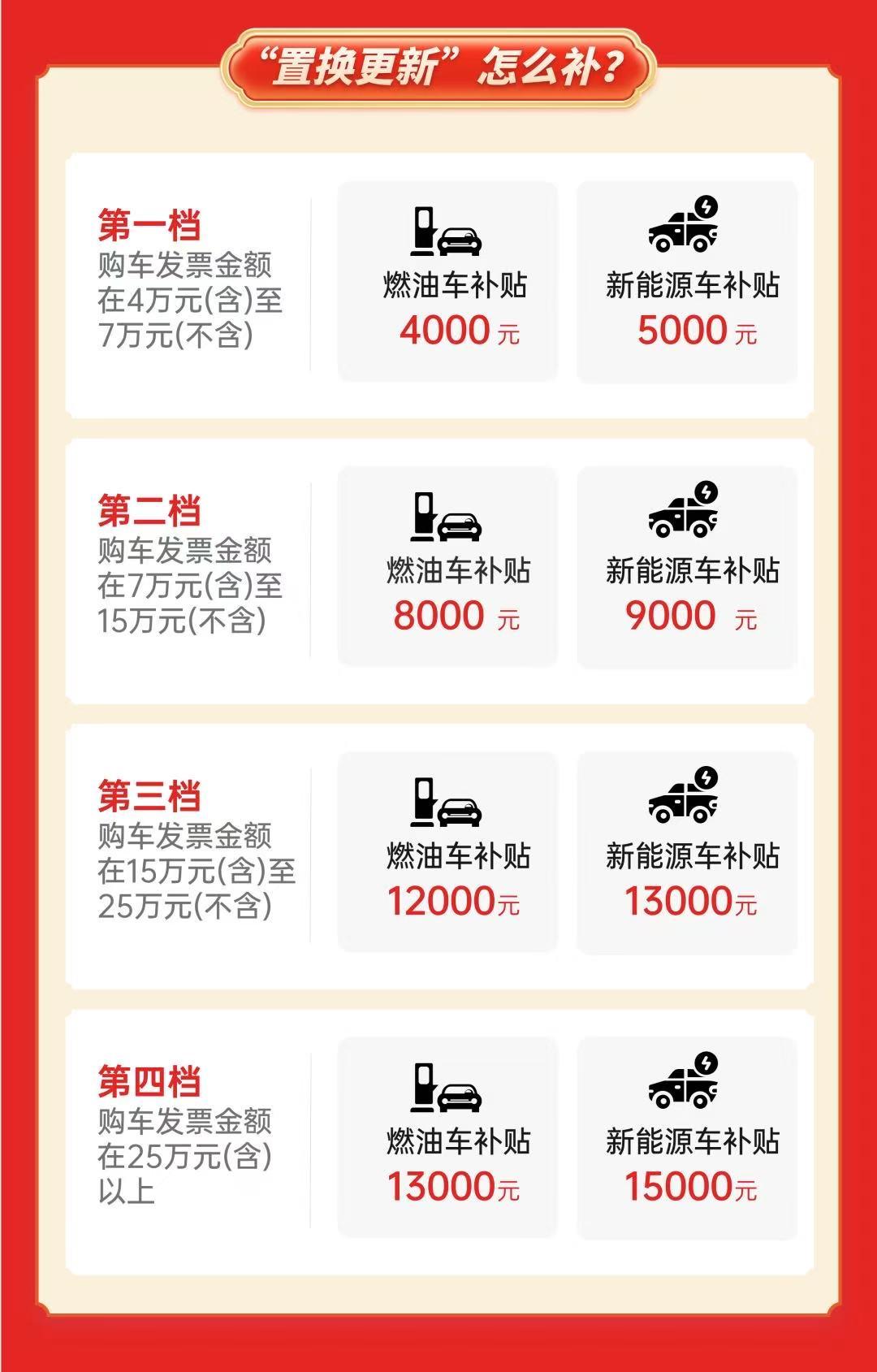 第四档。购车价格为25万元(含)以上的,购买燃油车补贴13000元/辆,新能源车补贴15000元/辆。